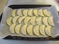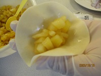 今日は餃子の皮でアップルパイを作りました。まず、リンゴを小さく切り、そこにシナモン、砂糖、レモン汁をかけレンジで6分・・さめるまでそっとしておきます。餃子の皮にリンゴを入れ餃子を包むように包み、ホットプレートを温め、焼きます。見た目は餃子ですが食べてびっくり!リンゴのはいったアップルパイの完成です。「ちょっと変わった感じでおいしかった」と、とても好評でした。次は何を作ろうか?スタッフも来週が楽しみですヽ(^o^)丿