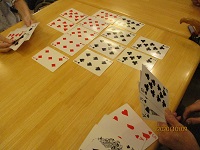 今日の午後は脳トレでトランプをしました。人数が多くなってしまうので二つのグループに分かれて行っています。ババ抜きでは「これだけしか残らない」と話されていた方がババを引いてしまい・・・「さっき持って行かれなければ出せたのにー!!」というのが何度か続き「まただ」となかなか上がれなかったり、隣の方のカードが見えてしまい「なに引いても出せない」とつぶやいてみたりと盛り上がり楽しく過ごす事が出来ましたました(^v^)