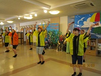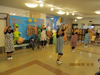 ・スタッフによる「パプリカ」と「だんべえ踊り」を利用者さんへ披露しました。今月もコロナ感染症予防により外部慰問(音楽演奏会)は中止となり、スタッフより出し物として「パプリカ」と「だんべえ踊り」を行ないました。利用者さん参加で、鳴子を持ってリズムに合わせ一緒に楽しみました。パプリカはNHK2020年応援ソングであり、だんべえ踊りは地元前橋祭りの元気が出る踊りから選曲しました。皆さんへ少しでも元気を与えられればと企画しました。!!利用者さんより『とても、よかった!楽しかった!』など声をかけてくださいました。とてもよかったようです。次回も楽しみに・・・(*^^)v