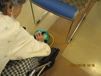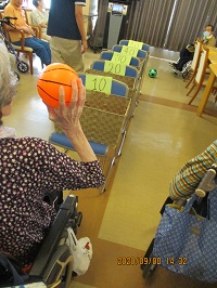 今日の午後は、運動レクでサッカーと玉入れをしました。点数の付いてる籠と椅子を用意します。そしたら先にボールを蹴り椅子の下をくぐらせます、ボールが止まった所が点数となります!蹴るのが出来ない方には手で転がしてもらいました。次にボールを上から投げてもらいます。籠に入れば点数獲得です。真っすぐ蹴れなかったり、ボールが投げても跳ね返ってしまったりして皆さん点を取るのに苦戦していました^_^;