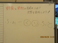 今日の午後は脳トレで「〇の中には何が入るかな?」を行ないました。〇の中には動物の文字が入ったり食べ物の名前が入ったりこれがなかなか難しい^_^:「牛」「ばく」「しゃち」「せり」「くり」・・いろんな文字が入ります。「これは難しいね」と言いながら皆さん頭を使って答えてくれます。今日は頭をフル回転出来ましたね。次の脳トレも頭を使い楽しい物にしたいと思います(^v^)