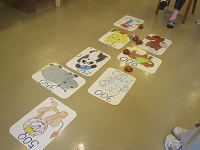 今日の午後は身体を動かすを目的に運動レクで「動物園ゲーム」をしました。いつもは点数の書いてある動物のカードをテーブルの上に並べてお手玉を手で投げるのですが、今日は床にカードを並べてお手玉を足の甲に乗せて蹴る様にして飛ばし点数を取っていきます!手で投げるのは簡単なのですが足でとなると・・・前に飛ばしたいのに上に蹴りあげてしまったり、遠くに飛ばし過ぎてしまったりと皆さん苦戦されていました(^_^;)上手く飛ばせなくて悔しがる方、ダメだねぇ~と笑いながら楽しまれる方と利用者さんの性格も見えてきます。今日も楽しく身体を動かす事ができました(^v^)