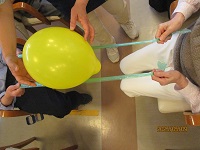 今日の午後は運動レクで風船バレーを行いました。ルールは簡単!向かい合って座って頂き二本の紐を使って何回ポーンと上にあげられるかを競いました。なかなか難しいようで数回で皆さん風船を落としてしまいました。ですので風船の数を増やして三個で行いました。あちこちから来る風船に「ほら来たわよ」「あらまた来た」等皆さんで盛り上がりました。次回も楽しい時間を過ごしたいですね( *´艸`)