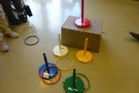 今日の午後のレクは、体を動かすを目的に『輪投げ』をしました。的をめがけて輪っかを投げるのですが・・・皆さん、なかなか入らず苦戦していました!「難しいなぁ~」と言いながら強く投げてみたり、優しく投げてみたり工夫をされていました。「もう少し強くないと入らないよ」など周りの方からアドバイスも聞こえてきました☆スタッフも参加し一緒に体を動かしました。今日もコロナ感染予防対策の為、隣り同士の間隔をとり皆さんで楽しみましたヽ(^o^)丿