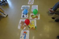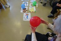 今日の午後は、運動レクで的当てゲームをしました。いつもの的当てはお手玉を使ってやっているのですが今回は風船を使ってゲームをしました。ただ膨らましただけでは軽くて的に乗らないので風船の口に重りとして洗濯バサミを1個つけます。その風船を3個用意し点数の書いてある的に向かって投げてもらいます。思ったよりも皆さん的に風船を乗せる事が出来ていました。思う様に的に風船が乗せられない利用者様がいたら「がんばれ!」や「もう少し強く投げて!」などの声をかている方もいました。今日もコロナ対策の為隣同士の間隔を空けながら初めてやるレクでしたが皆さんで楽しむ事が出来ました!また新しいレクを考えて皆さんで楽しめたら良いなと思っています(^-^)