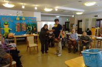 今日の午後レクは身体を動かすという事で「卓上玉入れ」を行ないました。テーブルの上に置いた籠に10個の新聞紙を丸めた玉を2回、合計20個投げてもらいます!なかなか入らない方や勢い余って跳ねて出てしまう方・・・「うまくいかないなぁ」と話される方も。順番を待っている方からは「いっぱい入れて下さい」など声を掛けてくださいました☆結果、1番多く入った方が16個でした。始めて行うレクでしたが今日も皆さん大いに身体を動かせたと思います(^_-)-☆
