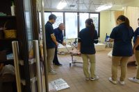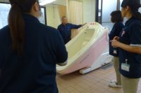 メーカーさんに取扱いの説明を受け職員は真剣に聞きながらメモしています。