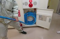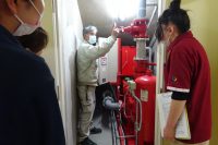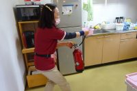 火災通報の手順や初期消火方法、消火器の使い方や消火用散水栓の使い方の確認をし