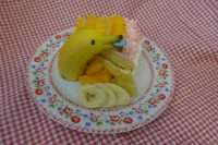 今日のおやつ作りは誕生日会のケーキを作りました。材料はスポンジ台・もも缶詰め・バナナ・ホイップクリームを使いました。バラの花になるよう桃の缶詰めを薄く切り飾り付け、バナナを使いイルカの飾りを添え、ホイップに食紅を使いピンク色で可愛らしく仕上げました。誕生日会では、当事者の方から『バナナが可愛い』利用者様から『美味しそうなケーキ』と声が上がりました!今日のおやつ作りも皆さんに満足して頂けました\(^o^)/