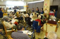 慰問によるハーモニカ演奏会を行ないました。本日の演奏会を皆さん楽しみにされておりました。懐かしい音色に皆さん、うっとりされていました。10曲終わり、最後は皆さんからアンコールの拍手!追加演奏で皆さんと歌い盛り上がりました。たっぷり1時間の演奏会を堪能出来たと思います。次回は4/24(金)に予約をさせて頂きました。皆さん楽しみにして下さい。