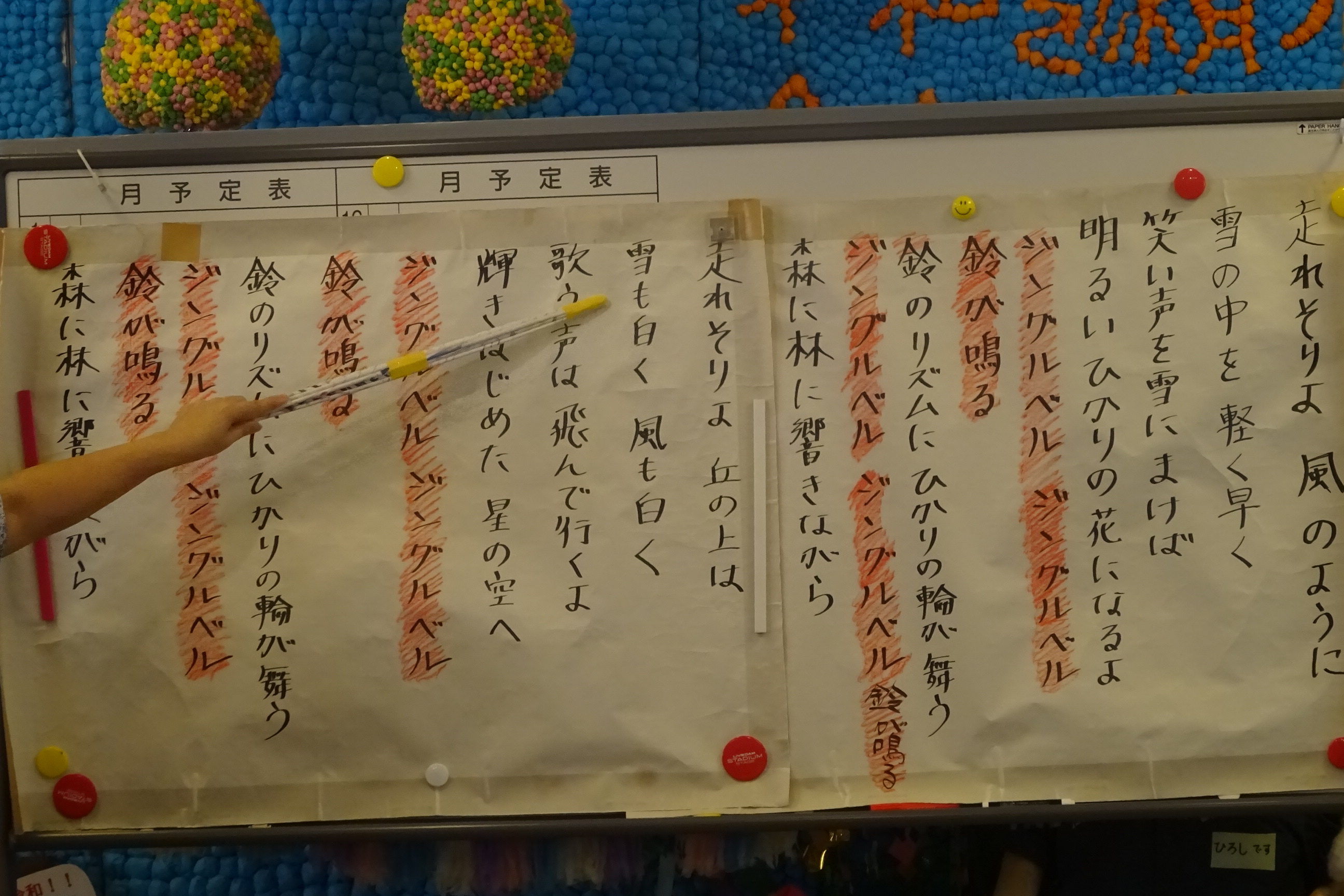 今日の午後のレクはクリスマスに向けてクリスマスソングの練習を行ないました。毎年アコーディオンとコーラスに合わせて「あわてんぼうのサンタクロース、ジングルベル」の歌に参加型で楽器演奏をしています。今年は初参加の利用者様も多く歌の練習から始めパーツに合わせてグループ分けし、タンバリン、マラカス、カスタネット、鈴の楽器で練習をしました。初参加の方も3回目ぐらいになると音にのり上手に音を出す事が出来ていました。クリスマス会に向けて、練習を頑張ります(^^♪
