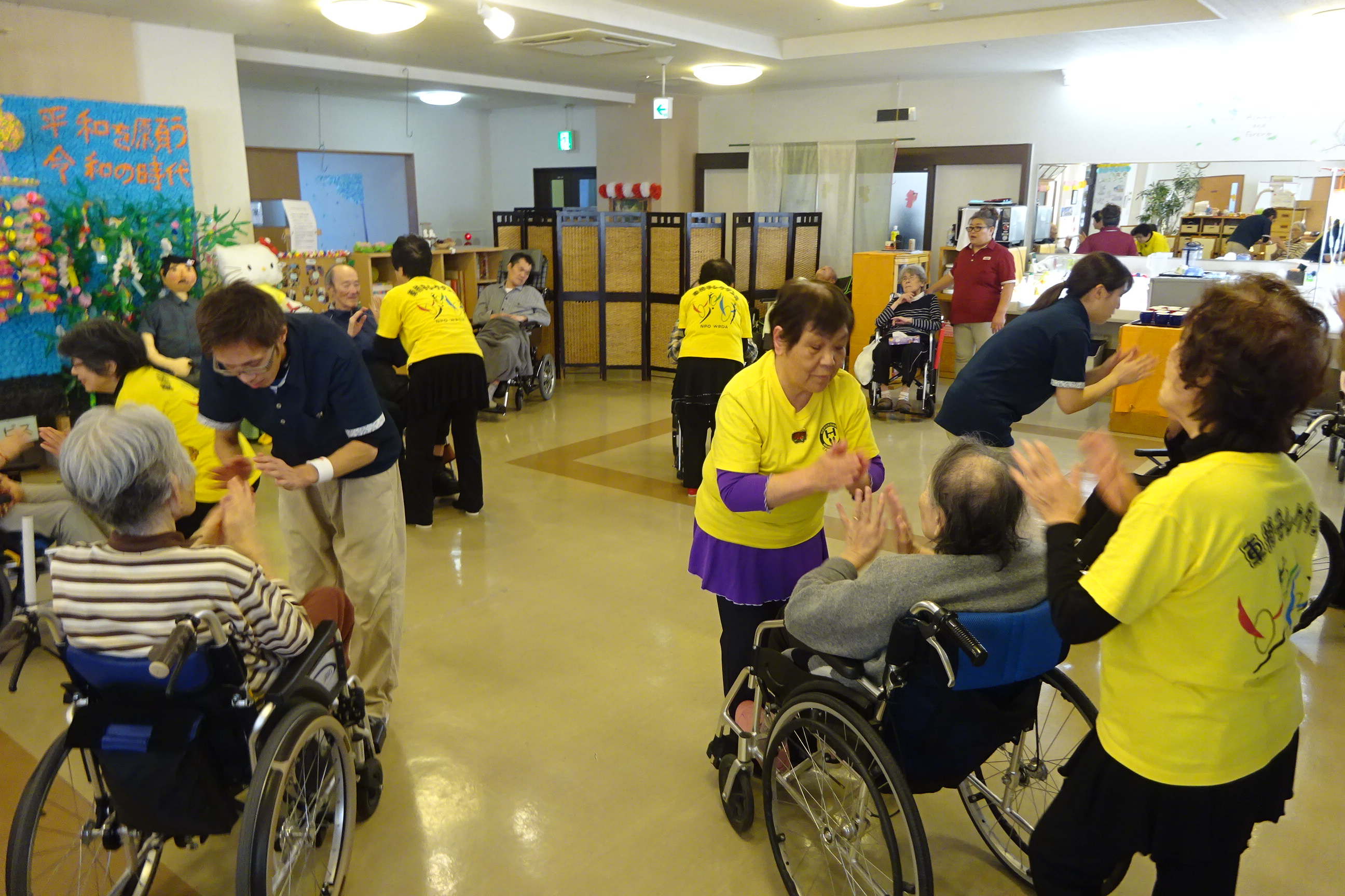 今日の午後のレクは「♪車椅子ダンス♪」!!始まる前から利用者様も楽しみにされており久し振りの再会に利用者様もダンスチームの方達も嬉しそう(^u^)馴染みの曲の「ああ~人生はに涙あり」からスタート!続いて、「二人は若い」「鐘の鳴る丘」他6曲程ダンスを楽しまれました。スタッフも入り大きな輪になったり小さな輪になり曲に合わせてダンスを楽しまれ、顔を見合わせるとお互い笑顔になりダンスを通してコミュニュケーションも図れた様です。次回も楽しみですね(^O^)/