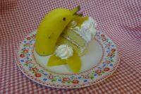 今日は手作りおやつの日で誕生会のケーキを作りました!白桃を薄くスライスして花のモチーフに飾り付け可愛いケーキが出来ました!誕生日の主役の方には、お馴染みのバナナのイルカを添えて盛り付けました。主役のご利用者様は誕生日ケーキを眺め胸が一杯と感動されていました。