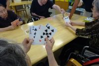 今日の午後は脳トレレクは、利用者同士で「トランプゲーム」行いました。ババ抜き・神経衰弱です。!写真)皆さん集中して行われております。神経衰弱ではヒントを出したりして応援しています。(^_^;)!毎週のレクに脳トレで脳の活性化を図っています今日も皆さん楽しめたようです(*^^)v