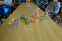 今日のレクは運動レクでテーブルボーリングをしました。テーブルに並べたピンに向かってボールを転がしますがボールの大きさも2種類あり、大きいボール小さめボールを選んで転がしますが、狙ったピンに届かずボールがテーブルから落ちてしまう方も多く、ピンが倒れた時は皆さんから拍手が出たり盛り上がります!最後はスタッフも参加しました。少し時間があったので風船バレーをしました♪♪今日も程良い運動で身体を動かし楽しんで頂けたようですヽ(^o^)丿