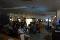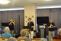 慰問によるジャズ演奏会を行ないました。ジャズが好きな利用者様が多く定期的に慰問に来て頂いています。グループ名は『A・K・O』本日の演奏会を皆さん楽しみにされています。本日は、サックス(アルト・テナー)とトロンボーンの組合せで演奏を聞きました。ジャズナンバーをメインに演奏です。曲の歴史や解説をして頂きながら演奏も楽しまれました。皆さん自然とリズムに合わせて手拍子や足でリズムを取り前に乗り出して聴いている方もいました。最後の曲が終わると皆さんからアンコールの拍手!『コーヒールンバ』を追加演奏で聞かれ盛り上がりました。たっぷり1時間の演奏会を堪能出来たと思います。次回は9月に予定しているので皆さん楽しみにして下さい。