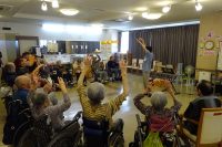 皆さん楽しみにしている♪音楽療法の日♪です。 今井先生による音楽療法の授業です。初めに音楽体操を行ないました。!曲は5月に関連した歌を歌い始め、その後温泉に関わる歌を数曲歌いました。楽器では(マラカス・鳴子・太鼓)を使ったりして音楽を楽しみました。皆さん豊かな表現の仕方が見られ声も出ておりました。楽器を使うとうまく歌に入りやすい様です。最後は元気な歌を歌い、そして三三七拍子で締めて終了。♪♪今回も楽しい音楽の時間になった様です♪次回は5/9を予定しています。(^O^)/
