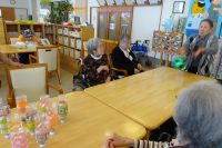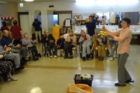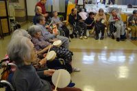 皆さん楽しみにしている♪音楽療法の日♪です。 本日から今井先生による音楽療法の授業となりました。挨拶(自己紹介)をして音楽体操を行ないました。!曲は春に関連した歌を歌い、その後楽器(マラカス・鳴子・太鼓)を使ったりして音楽を楽しみました。皆さん豊かな表現の仕方が見られ声も出ておりました。楽器を使うとうまく歌に入りやすい様です。最後は元気な歌を歌い、そして三三七拍子で締めて終了。♪♪今回も楽しい音楽の時間になった様です♪次回は4/25を予定しています。(^O^)/