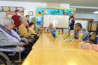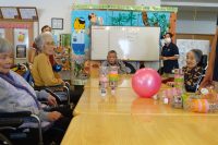 今日の午後のレクは、テーブルボーリングをしました!テーブルの上に並べたピンを目掛けてボールを転がしますが、大きさの違うボールを二個用意し好きな方で投げてもらいますが、始めから大きいボールで優しく投げる人、小さめのボールで勢いよく投げる人、狙いは様々ですが、皆さん初めから高得点でピンをたくさん倒せていました!ボードに書かれた得点を意識しながら皆さんゲームを楽しまれていました!
