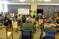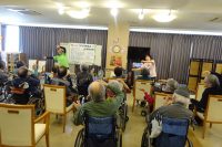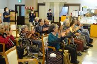 今日の午後のレクは慰問による『ラフターヨガ』で、皆さん大笑いをして楽しまれました!「笑いヨガは副作用がない薬」として、免疫力を上げるにはとても良いそうです。身体は作り笑いも本物の笑いも区別がない事が科学的に照明されているそうで、つくり笑いも本物の笑いと同じ効果が出て人を癒快にするホルモンが出て免疫細胞が活発になるそうです。手拍子、呼吸法、子供にもどるおまじない、エクササイズが基本で、今回初めて参加の方は戸惑いながらも次第に馴染み、皆さん作り笑いから本物の笑いになりお腹から笑って!笑って!免疫力アップしました!!