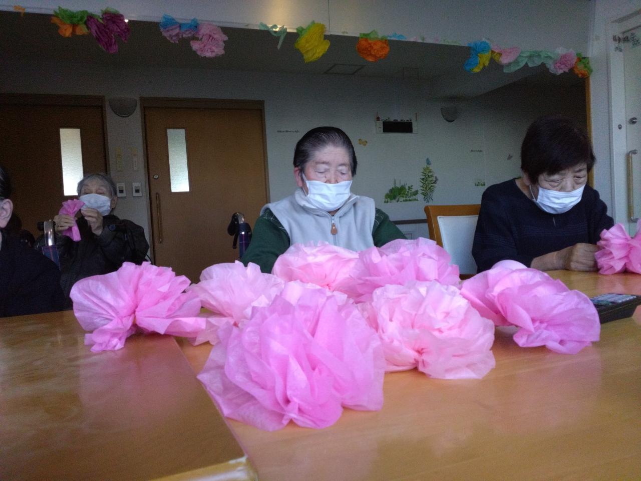 皆さんこんにちは、介護付き有料老人ホームグリ-ンライフ中央前橋です。本日のレクリエーションは桜の開花に因んでお花紙で桜飾りを作っていただきました。地道に作った暁には、壁にきれいな桜の木が完成することでしょう!!楽しみです(^^♪