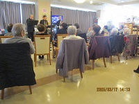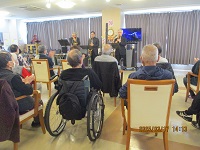 今日の午後は慰問演奏会でAKOの皆さんがいらして下さいました。利用者の皆さんはとても楽しみにされていたようで、「今日は何を演奏してくださるのかしらね」と待ち遠しい感じでした。AKO!で始まった演奏会は「青い山脈」「月がとっても青いから」「有楽町で逢いましょう」など皆さんが馴染み深い曲で40年代から60年代のヒット曲を演奏してくださいました。アンコールの「涙をふいて」は皆さんで手拍子しながら歌っている方もいました。また次回も楽しみにしています(^^♪