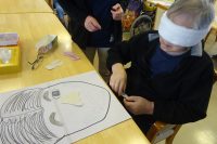 新年を迎え、デイの天井には手作りの凧が天を舞っています!お正月を楽しもう!と本日のレクは「福笑い」をしました!一人づつ目隠しをして、周囲の利用者さんの掛け声を聞きながら顔のパーツを置いて行くのですが、右や左、中央の感覚が掴めず「難しいな」と言いながら、掛け声通りにパーツを置き、出来上がった顔を見るとパーツがずれていたり、整った顔に仕上がったり色々な表情の顔が出来ておもしろかったです!参加利用者様も、お正月の遊びを懐かしく楽しめたようです!!