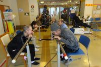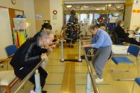 先週までは、暖かい日が続いていましたが、12月に入り寒さが厳しくなってきました!気温が低いと身体も強張り柔軟な動きが低下しますが、デイの利用者様は今日も元気にリハビリに参加され、マシンを使用してのパワーリハビリ・複合トレーニングでは平行棒や小物を使用してのリハビリを実施しています。カウントの声も大きい声が出て、リハビリホールは活気で元気いっぱいでした!