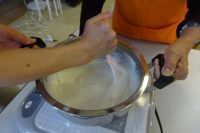 今日は、おやつ作りの日です!今日のメニューは「牛乳もち」を作りました。牛乳にカタクリを入れ良く混ぜ湯がきます。ねっとりした所で氷水に冷やし、固まった所で完成です。配膳では牛乳もちの上にきなこと、黒蜜をかけ出来上がりです。各自担当者によって分担作業で作っています。大変上手く出来上がりました。美味しいかったと好評でありました。 次回も手作りおやつ、楽しみにして下さい。(^-^)