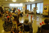 今回は対戦型ではなくて輪になっていただき、真中に職員が入り利用者さんから職員へ職員から利用者さんへと風船のやり取りをしていきます。皆さん笑顔いっぱいで楽しそうでした(*^^)v職員も参加してみなさん大変盛り上がりました☆真中に入ってくれた職員は…ヘトヘトになっていました(^_^;)今日も楽しい運動レクの時間でした\(^o^)/