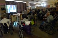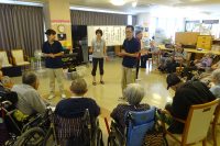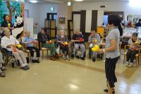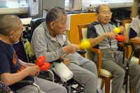 皆さん楽しみにしている♪音楽療法の日♪今回もテーマは自己表現!「虫のこえ」から始まり赤とんぼを歌い、マラカス楽器を使い「〇〇のまね」で、1人の方の鳴らし方を見て聞いて、皆で同じように鳴らしたり、身体を動かしてリズム遊びをしました。カエルのうたでは、ふたつに分かれ輪唱して歌いました。皆さん個性豊かな表現の仕方が見られ声も出ていました。自己表現と言っても中々難しい事ですが、楽器や歌を取り入れると表現しやすいようです。最後は故郷の空で、しっとりと♪♪今回も楽しい音楽の時間になった様です♪次回は9/27を予定しています(^O^)/