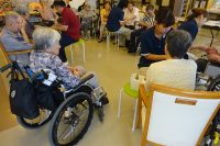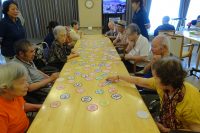 今日の午後は脳トレレクは、「カード取り」を行ないました。!職員により取る札を読み上げ、利用者さんに札を取って頂きます。札は手作りで、赤色の青・黒色の赤・黄色の赤と十数種類あります。書かれている文字の色とその文字を読み上げます。最初は混乱して間違えもありましたが、徐々に出来るようになっています。以外と本人の目の前にある札が以外と取れません。反対側は良く取れています。皆さん集中して行われていました。(^_^;)!毎週のレクに脳トレで脳の活性化を図っていますが今日も皆さん楽しめたようです(*^^)v