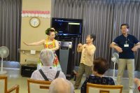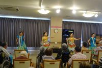 演芸慰問公演です。ハワイアン演奏に合わせフラダンスを堪能致しました。今回は前橋市総合福祉会館ボランティアセンター様の紹介による慰問公演でした。フラダンスの踊りも音楽によって違い、しなやかな動きと笑顔が大変素敵でした。最後に利用者と職員も一緒にフラダンスを行ない楽しく踊りました。次回も予約をさせて頂きましたので楽しみに待って下さい。