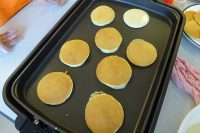 今日は、おやつ作りの日です!今日のメニューは「どら焼き」を作りました。ホットケーキミックスに卵を入れ良く混ぜてホットプレートで焼き生地を作ります。餡を手で平丸に作り、出来た生地に挟んで完成です。各自担当者によって行っています。焼く臭いが美味しそうと伺いながら、大変上手く出来上がりました。食べても美味しいと好評でありました。 次回も手作りおやつ、楽しみにして下さい。(^-^)