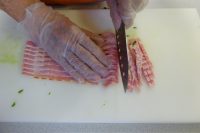 今日は、おやつ作りの日です!今日のメニューは「ちぢみ焼き」を作りました。具材の下準備する人(1・にら・ベーコンを刻む。2・ちぢみ粉に刻みを混ぜる。)焼く人(ホットプレート)配膳準備する人(カットする・お皿に盛り付ける)各自担当者によって行っています。焼く臭いが美味しそうと、大変上手く出来上がりました。食べても美味しいと好評でありました。 次回も手作りおやつ、楽しみにして下さい。(^-^)