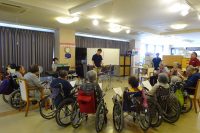 皆さん楽しみにしている♪音楽療法の日♪今回もテーマは自己表現!「うみ」から始まり海・村まつり・恋の季節ではたいことシンバルを利用者代表、職員代表で叩き、皆で歌いました。マラカスで「〇〇のまね」で、一人一人の鳴らし方を見て聞いて、皆で同じように鳴らしたり、身体を動かしてリズム遊びをしました。また、今日の気分はどうですかとシンバルを叩いて頂きました。皆さん個性豊かな表現の仕方が見られました。自己表現と言っても中々難しい事ですが、楽器や歌を取り入れると表現しやすいようです。最後は夕焼けこやけで、しっとりと♪♪今回も楽しい音楽の時間になった様です♪次回は8/23を予定しています(^O^)/