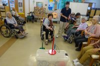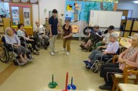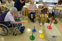 点数の書いてある的に輪を投げて頂きます。難しい所の的は点数も大きいです。5回投げて合計で順位を付けます。私は出来ないわ!と話されていた方も、投げられるかなぁ~と心配していた方も、やる気満々の方も、笑顔いっぱいで楽しそうでした(*^^)v♪♪みなさん大変盛り上がりました(^O^)/今日も楽しい運動レクの時間でした!!