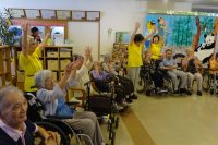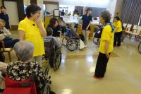 今月も慰問による車椅子ダンスを行ないました。車椅子ダンサーズの方と利用者様がペアになり曲に合わせてダンスがスタート!赤いハンカチ、高原列車、水戸黄門のテーマ、他全6曲を踊りました。皆さん円を描きながら踊りパートナーが変わって行きます。ペアによっては控え目に踊る人、元気に踊る人、楽しく踊る人と色々ですが、充実した1時間を楽しまれました!次回は9月を予定していますヽ(^o^)丿