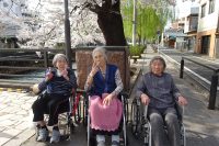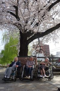 今日の前橋は26℃で日差しも強く暑い日でした!桜も満開となり施設近郊にある桜を見学に行ってきました!満開の桜の下には広瀬川が流れ、通り抜ける風が幾分涼しく感じられ満開の桜を見上げて「桜ってほんときれいだねぇ」と桜の花に見惚れながら川の流れる音を聞き、気分転換が図れたようでカメラを向けると笑顔一杯でピースサインの素敵な写真が撮れました!皆さん満足されたようです❀❀❀