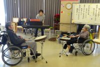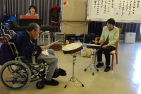 皆さん楽しみにしている音楽療法の日♪今回もテーマは「自己表現」を目的に楽器(鈴・太鼓・トーンチャイム)で自己表現をしてもらいました。太鼓では2人一組で餅つきをイメージして太鼓を叩きましたが、相手のリズムを見ながら叩く人や、自分の音だけを強調して叩く人、性格や人柄が出ていました!歌はスキー、冬景色、トロイカから始まり津軽海峡、湯島の白梅、ひな祭りを歌いましたが今回は始めから大きな声が出ていたので活動的な面が多く見られ音楽の時間を楽しまれたようですヽ(^o^)丿