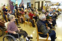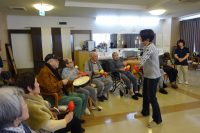 今回の音楽療法も「自己表現」を目的とした内容で冬の歌をテーマに、雪・冬の夜・トロイカ・たき火など全10曲を歌いマラカス、トーンチャイム、タッチベル・鳴子・太鼓の楽器を使い身体の動きに音を合わせ自己表現する遊びをしましたが、皆さん隣の方の動きと違う動きを考えたり、他の方よりも目立とうと大きな動きをする方もいて、普段は見られない様子が見られました。今回も皆さん楽しく参加出来た様です(*^^)v