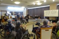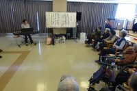 慰問コンサートとしてケーナ演奏会を行ないました。グループ名は『ケーナサークル鳥と風』様です。演奏ではコンドルは飛んでいくより始まりました。サンフランシスコへの道・青い山脈・高原列車は行く等を演奏し11曲入れて頂きました。途中楽器の紹介をしながら、パタカラ体操で声出しや身体を動かしました。最後は皆さんからアンコールの拍手で!追加で演奏(コンドルは飛んでいく)をして下さり演奏会が終了しました。次回もまた来て頂けるよう、お願いしています。楽しく良い音楽で大変良かったと伺っています。