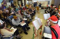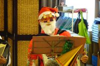 クリスマスコンサートとしてアコーディオン演奏会を行ないました。クリスマスには定期的に慰問に来て頂いています。グループ名は『アコーこだま』様です。サンタクロースの衣装で登場し進行トークでも笑いと冗談を入れながらおもしろ・おかしく始まりました。演奏ではクリスマスソングからスタートし、ジングルベル・あわてんぼうのサンタクロース、赤鼻のトナカイ・聖この夜等を演奏、他に唱歌や童謡、歌謡曲を10曲入れて頂きました。合同演奏で利用者もすず、タンバリン、カスタネットを演奏しながら歌いました。最後の曲が終わると皆さんからアンコールの拍手で!追加で演奏して下さり盛り上がって演奏会が終了しました。来年もまた来て頂けるよう、お願いしています。楽しく盛り上がり大変良かったです。