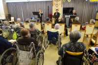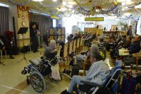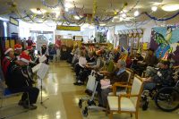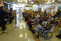 クリスマスコンサートとしてジャズ演奏会を行ないました。ジャズが好きな利用者様が多く定期的に慰問に来て頂いています。グループ名は『A・K・O』今日の演奏会を皆さん楽しみにされています。演奏が始まり1曲目は水戸黄門のテーマソングからスタートし、ジングルベル・赤鼻のトナカイ・聖この夜等を演奏、他に歌謡曲2曲とジャズナンバーを5曲入れて頂きました。皆さん自然とリズムに合わせて手拍子や足でリズムを取り前に乗り出して聴いている方もいました。最後の曲が終わると皆さんからアンコールの拍手!気分を良くしたメンバーの方達が『コーヒールンバ』を追加で演奏して下さり盛り上がって演奏会が終了しました。次回はラテン系音楽を数曲リクエストしました。3月に予定しましたので皆さん楽しみにして下さい。