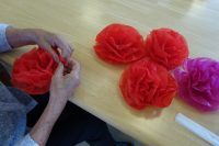 今日のレクでは、運動会に飾る花を作りました。作業療法として手先を使うには大変効果がある花作りは、お花紙を一枚づつ広げて行くのが簡単そうで意外と難しい作業ですが、職員や利用者様との談話を楽しめる時間でもあり、話をしているうちに、お花が出来上がっています。一つ、二つと開いた花が増えるのは達成感にもなります。来月の運動会に向けて、飾り物作り(輪飾り・旗飾り・お花作り)を皆さん頑張っています。華やかな活気ある飾りが出来ると思います(^-^)♡