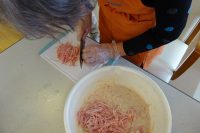 今回はお好み焼きを作りました。粉を計り水で溶いて具材を入れ一緒に良く混ぜて、1人分のサイズに小分けしてホットプレートで焼きました。焼き上がった所でトッピングとしてマヨネーズをかけ鰹節や紅ショウガを乗せ完成です。出来栄えも大変綺麗に出来ました。食べても美味しかったと伺い良かったです。メニューについては作りたいもののリクエストを受け付けております。