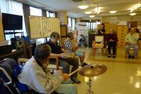 音楽療法を受けました。初めは、雨降りお月さまを歌いその後、参加者全員でマラカス(楽器)を持って歌を歌いました。虫の声、即興で数曲歌い、歌いながら楽器と組合せ音楽の楽しさへ引き込んで行くプログラムです。楽器ではベルや太鼓・ラッパ・シンバルを使い演奏に合わせ歌いました。写真では各自の担当者で楽器を持って歌に合わせて演奏会を行なってます。太鼓を叩き音を確認しています。音楽を通して楽しい時間を過ごせました。次回は9月14日(木)14時~15時に音楽療法です。見学や体験も受付けています。