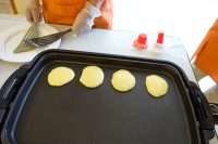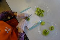 今回はパンケーキのフルーツ盛り合わせを作りました。パンケーキを焼き、数種類のフルーツを切り分け準備をしました。お皿の中心にパンケーキを乗せその周りにフルーツを添え、最後にクリームとチョコレートでアクセントを入れ完成です。見てもきれいに出来、食べても美味しかったと伺い良かったです。メニューについては作りたいもののリクエストを受け付けております。