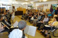 アコーサークル「こだま」様によるアコーディオン演奏慰問公演を行ないました。七夕から唱歌や懐メロ歌謡曲10曲を演奏され皆さんも一緒に歌を歌いました。また司会者の変装や軽快なトークで皆さんを楽しくさせて頂き笑いも多く聞かれました。次回の予約として12/22とさせて頂きました。いつも慰問の方には大変お世話になりありがとうございます。