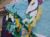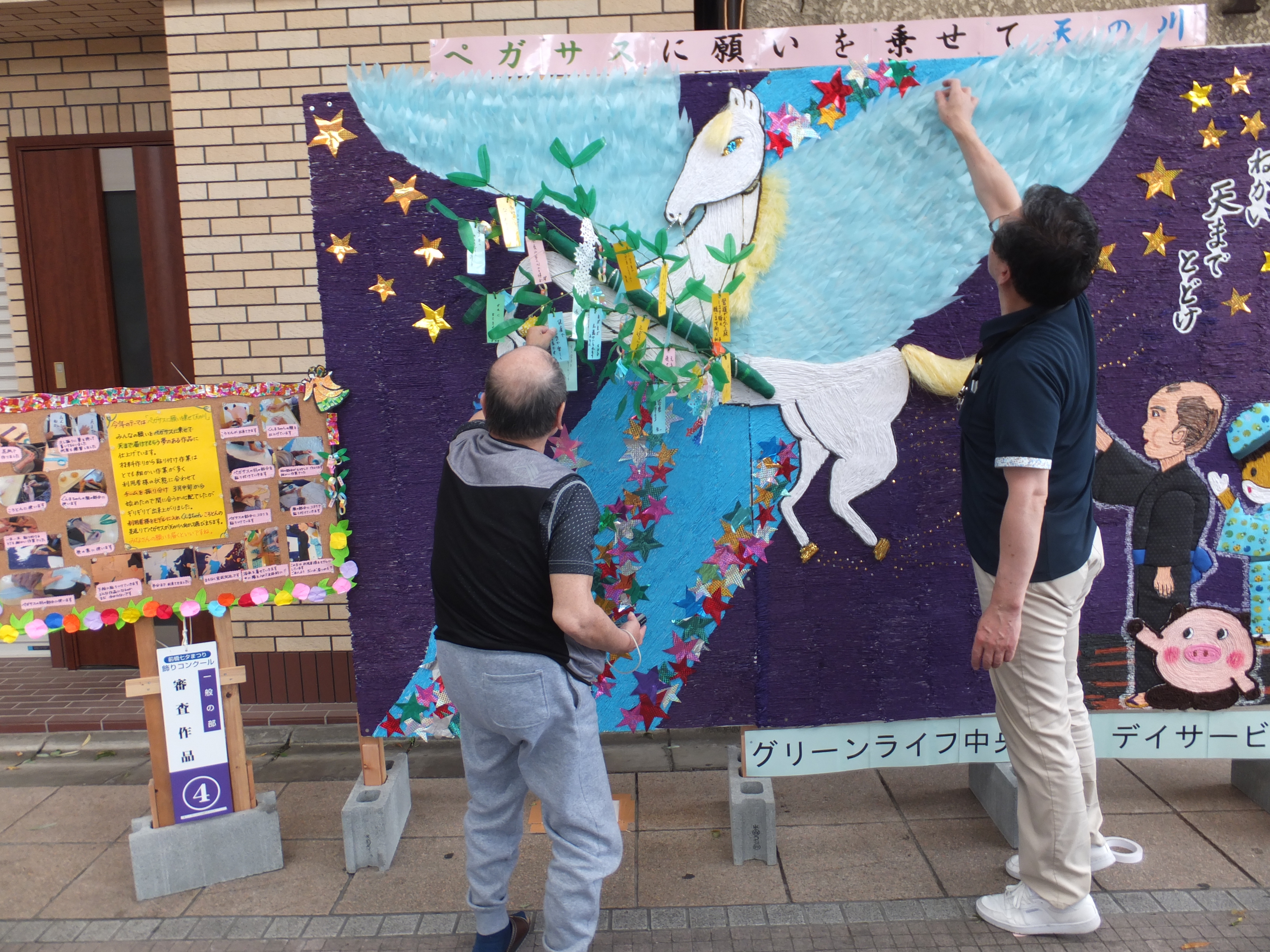 皆さんの協力により作品製作7月4日に完成しました。翌5日に前橋商店街(弁天通り)に設置飾り付けを行ないました。製作者代表1名と職員3名で行き、皆さんから書いて頂いた短冊を付けたり、作品の細かい修正や羽根や馬のたて髪の表現など行ない約2時間程かかりました。最後に作品製作過程の写真とコメントをボードで置きました。